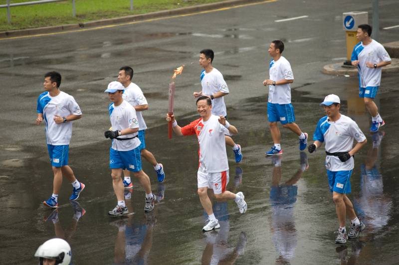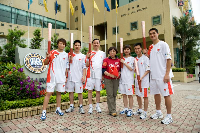 吳教授於2008年與浸大師生一同運送北京奧運聖火,圖為與太太郭蜀華女士及參與師生合照